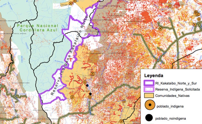 AIDESEP’s map makes it clear just how under threat the “isolated” Kakataibo are - not just from the cocaine trade, but from two logging concessions overlapping their reserve. Conspicuously, the most concentrated deforestation has taken place near the clandestine runway.