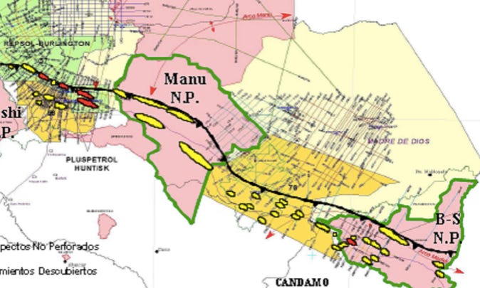Have a look at the map below and it’s obvious what areas Vera Gargurevich et al have in mind. The Camisea gas fields - marked by the two big red blobs to the centre-left, discovered by Shell in the 1980s - have produced huge quantities of gas since 2004, but running from there in a south-easterly direction, into Madre de Dios, there are any number of potential deposits, marked in yellow. Some of them, to the far east, lie under the Bahuaja Sonene National Park (“BSNP”), some of them under the ACR, not identified on the map, and some of them, apparently the very biggest, are under Manu, whose hydrocarbon potential has been known about for years. Companies were exploring the region in the 1960s before the park was established and shortly afterwards too, and, as I’ve exposed in articles in The Guardian and elsewhere, the Netherlands-based firm Pluspetrol, which leads the Camisea consortium, has been interested in Manu as well. Indeed, evidence suggests that someone has actually been operating inside the park already, despite it being forbidden.
