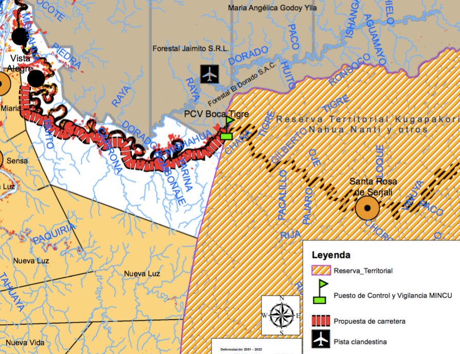 “This road has no legitimate justification,” three indigenous federations - AIDESEP, COMARU and CORPIAA - wrote in a stinging letter to Ministry of Transport functionaries and others four days ago, “other than to facilitate the invasion of the Kugapakori-Nahua-Nanti and Others Reserve [KNNOR] and thereby benefitting illegal loggers and narco-traffickers who have been operating in the upper River Mishahua and in the River Dorado area in particular where a clandestine airstrip is located, as the state knows full well.”