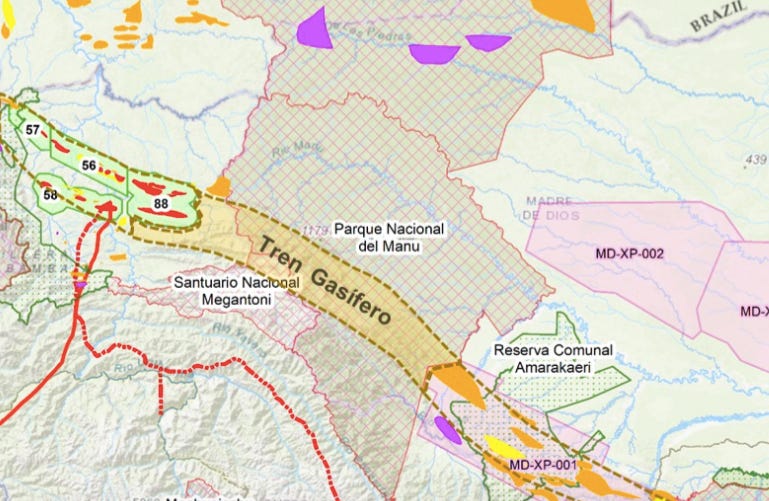 Other areas at threat include the even more well-known Manu National Park, which for years UNESCO called the “most biodiverse place on earth.” The map above shows an area which has been frequently - and mistakenly? - referred to as the “Tren Gasífero” which runs right through Manu and was described last year by the Energy Ministry as the location of a “new gas deposit” double the size of the Camisea reserves immediately to Manu’s west which have been exploited since the early 2000s.